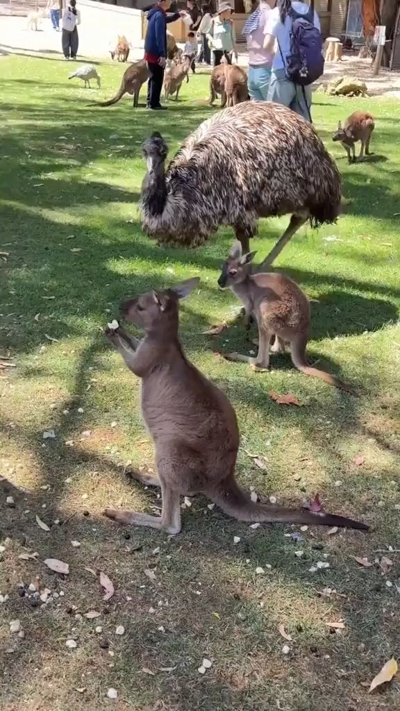 dieser diebische emu wurde auf frischer tat ertappt. er hinterlässt ein geschädigtes und völlig verwirrtes känguru zurück.